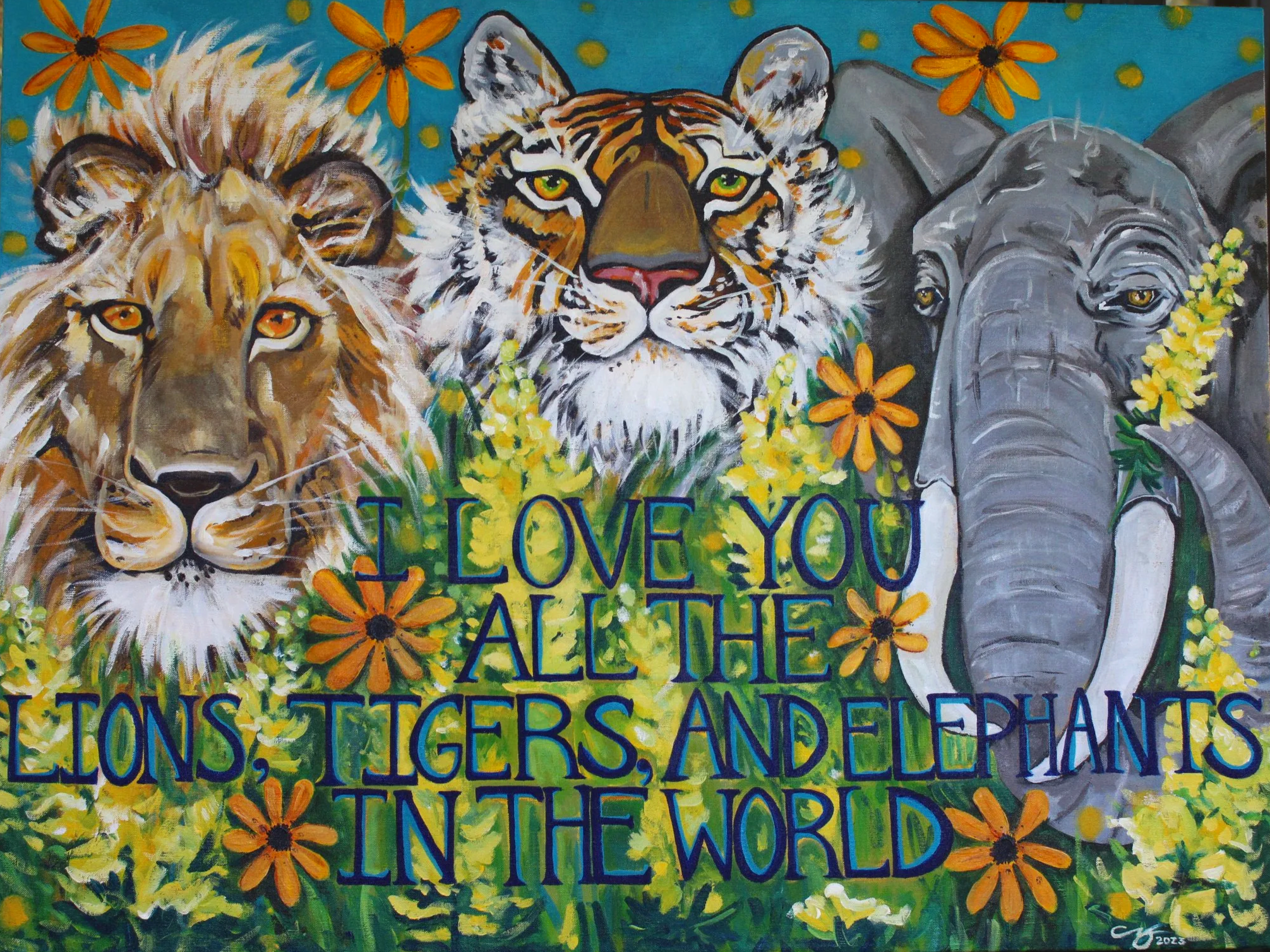 “I Love You All the Lions, Tigers, and Elephants in the World”, Detailed Commission, 24”x 48”, Acrylic on linen, 2023.